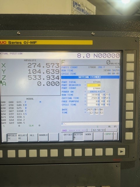 Fanuc 0i-MF Control. Table Size: 1200mm x 580mm. Travels X/Y/Z Axis: 1060mm/560mm/550mm. Max. table load 1000Kg. Spindle Type BBT40. Spindle Speed 15,000rpm. Spindle Power 25HP. Tool Capacity 30 ATC. Through Spindle Coolant. Spiral Chip Auger and Cart. Linear Guideway. 4th Axis Interface. PARKSON MNC-280R 4th Axis Attachment. (Year 2016)