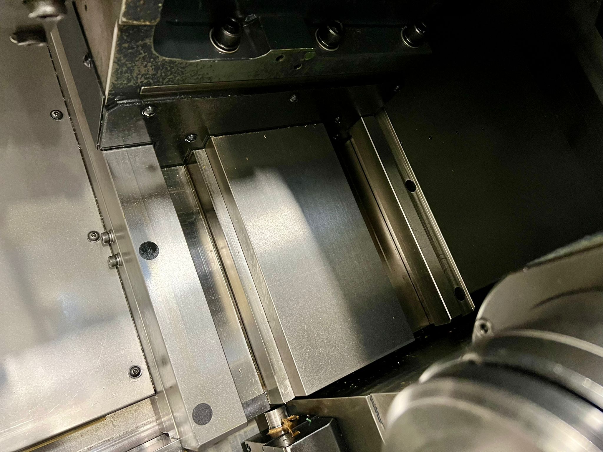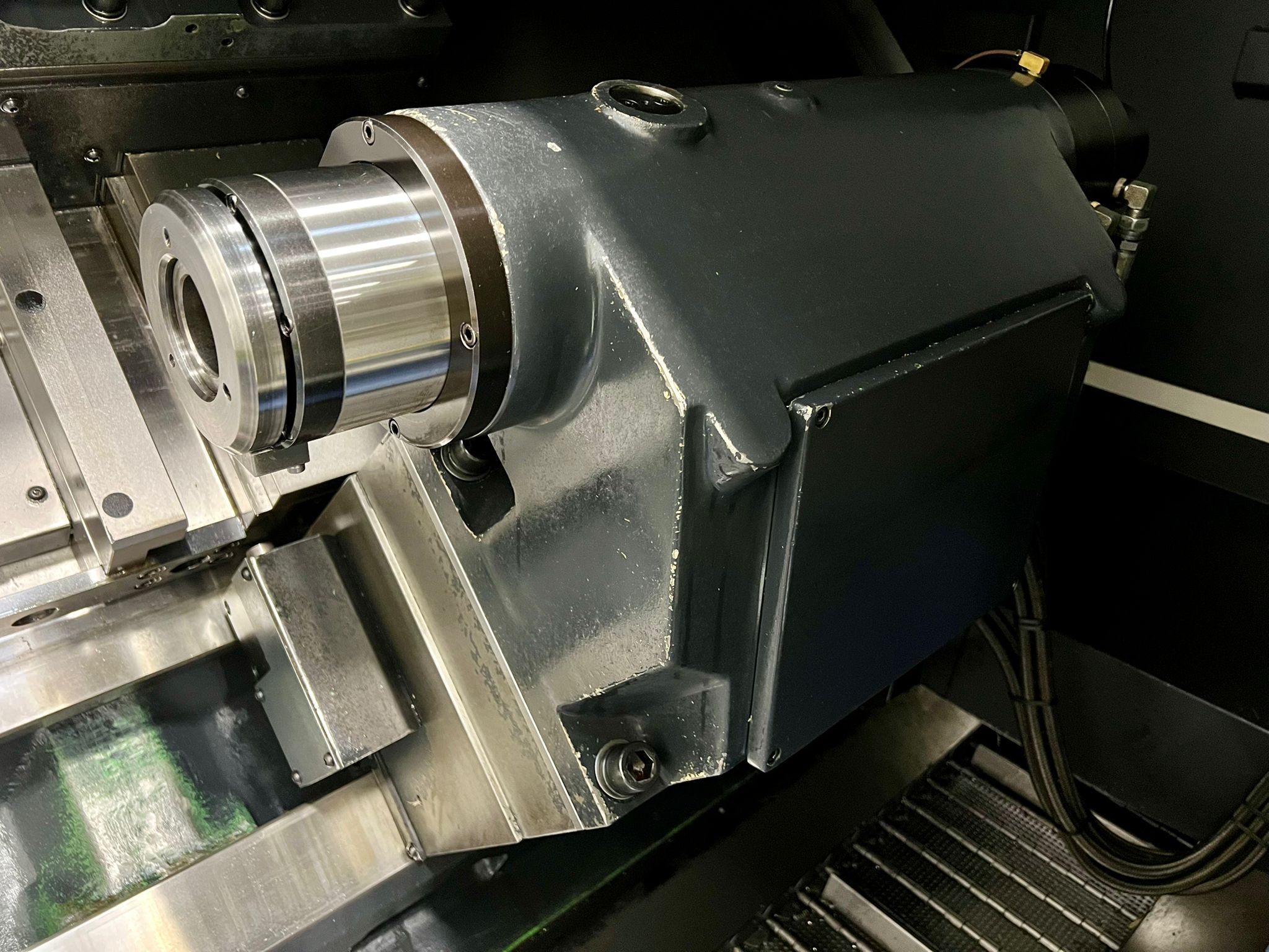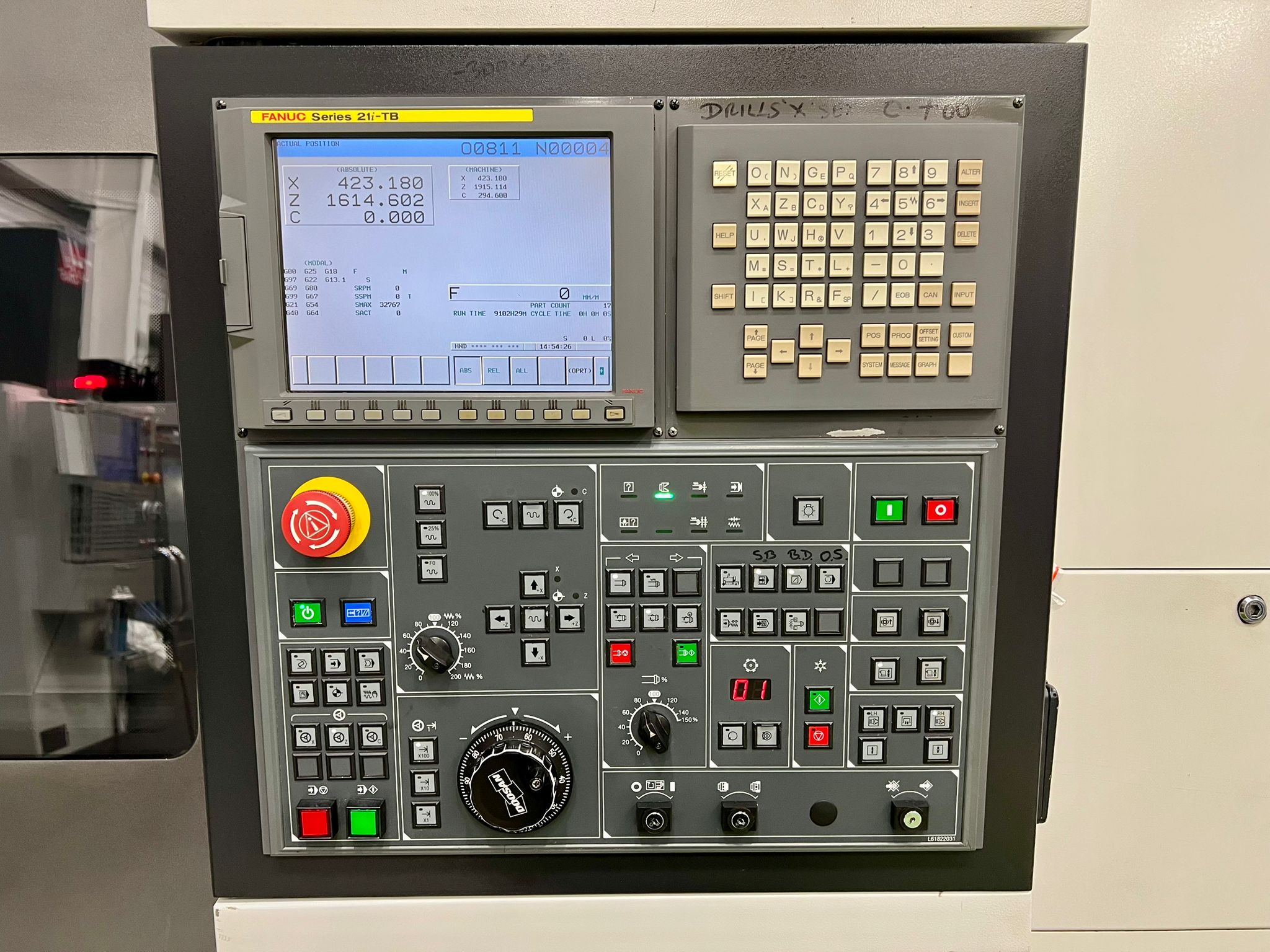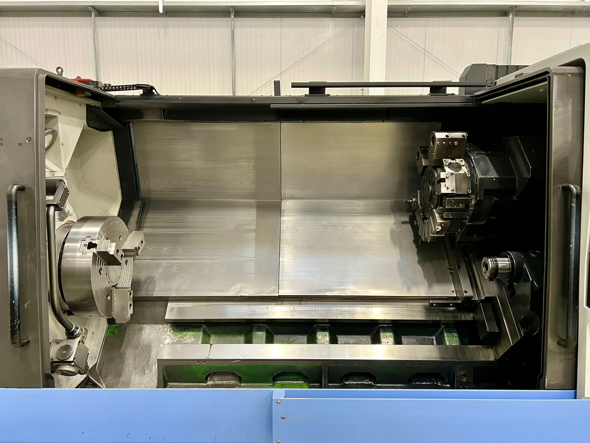 Swing over bed 900mm. Swing over cross slide 720mm. Turning dia. 650mm. Turning Length 2000mm. Bar capacity 165mm. Spindle speeds 1500 rpm. Spindle motor 45kW. 12 station turret. Complete with 533mm dia. Samchully 3 jaw powered chuck. Swarf conveyor. Swarf bin. Driven tooling speeds 3000 rpm. Driven tooling power 11kW. Fanuc 21i-TB Control. Cutting hours 7638 hours. Machine dimensions L x W x H 5732mm x 2217mm x 2270 mm. Approximate weight 9800 kg.