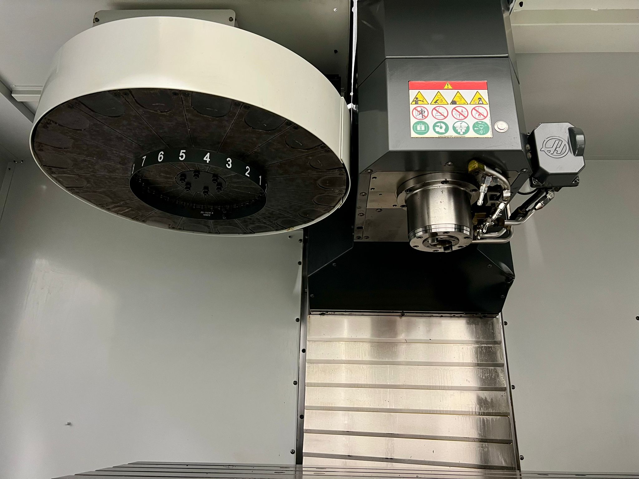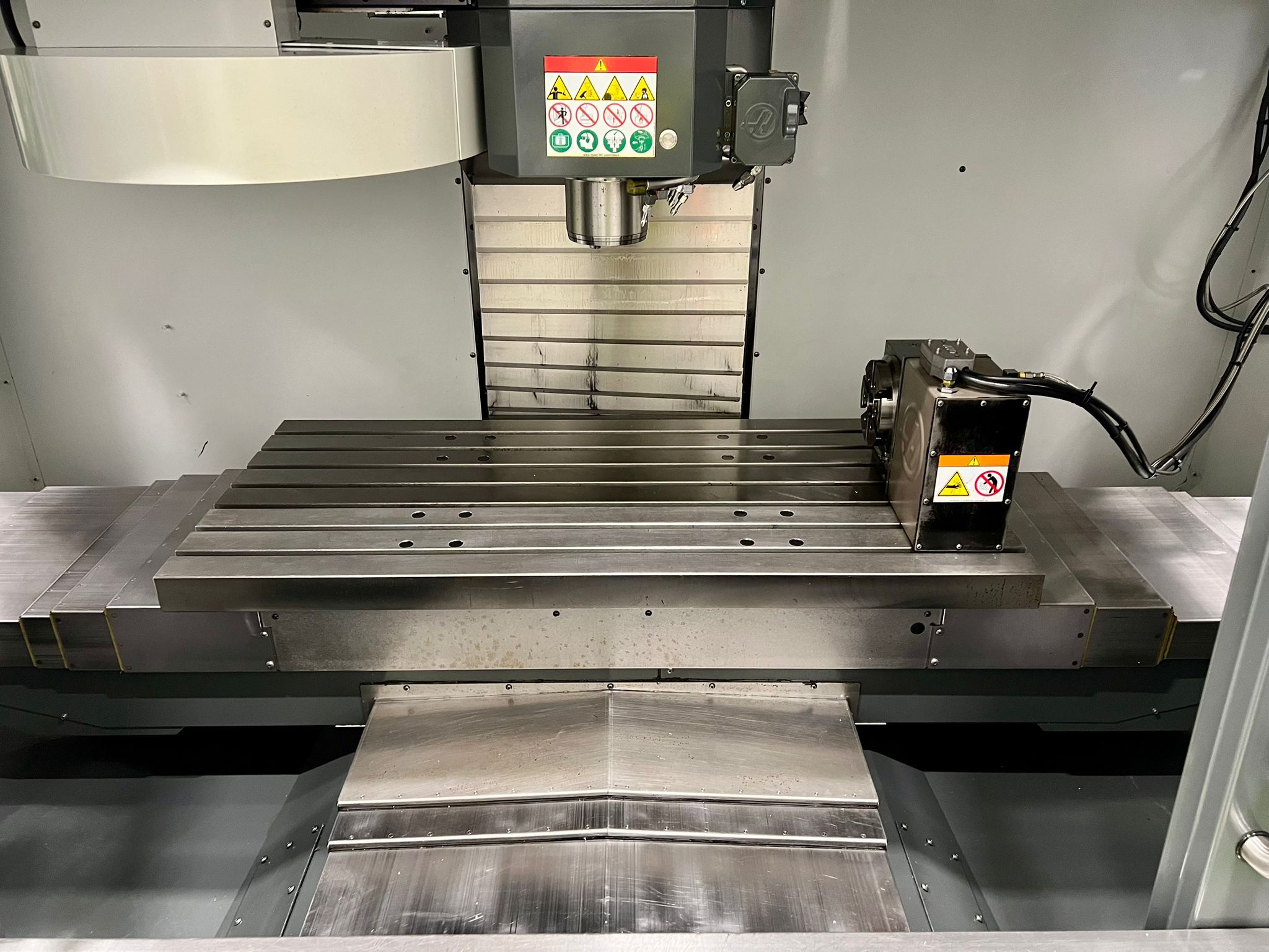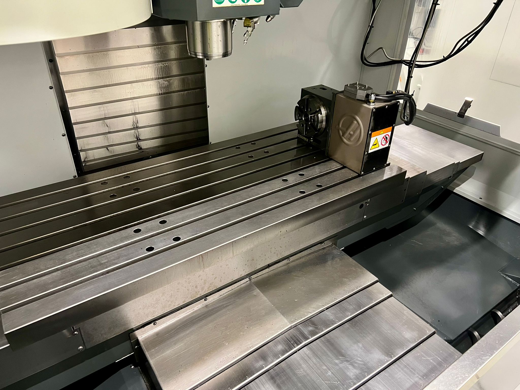Table size 1372mm x 635mm. X/Y/Z travels 1016mm/660mm/635mm. Spindle nose to table (min/max) 114mm/749mm. Maximum weight on table (evenly distributed) 1500 kg. Spindle power 22.4 kW (Direct drive). Spindle speeds 8100 rpm. Spindle taper BT40. Feedrates X/Y/Z 18m/min. 20 Station ATC. Toolchange speed 4.2 seconds. Maximum tool dia. (full) 89mm. Coolant capacity 200 litres. Machine complete with Haas 4th Axis Attachment. Selection of spindle tooling. Year 2019