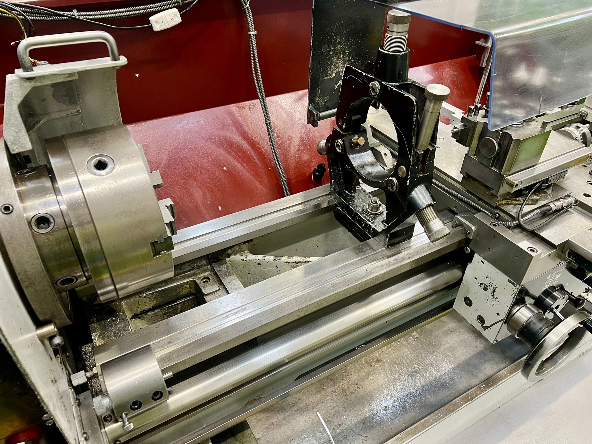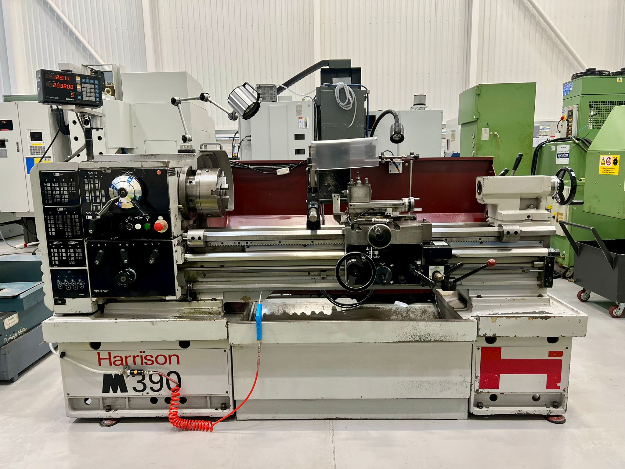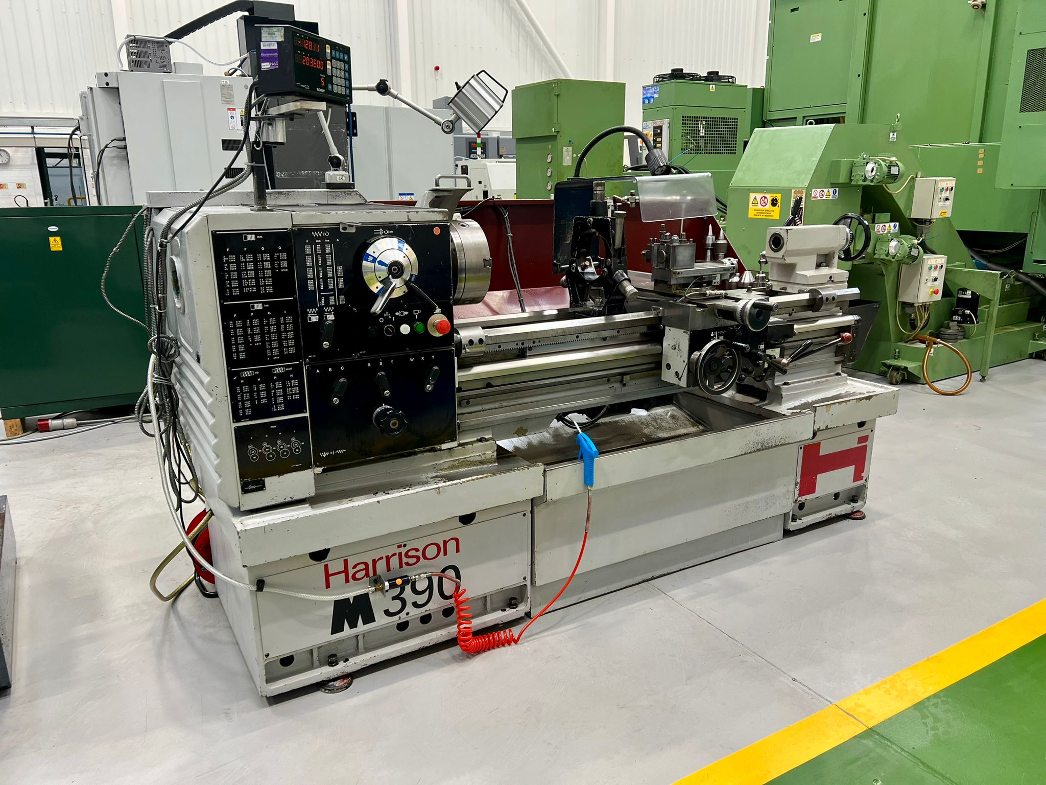 Swing over bed 390mm. Swing over cross slide 246mm. Swing in gap 585mm. Distance between centres 1250mm. Spindle bore 54mm. Spindle speeds 25-2000 rpm. Fitted with 240mm dia 3 jaw chuck. 355mm dia. faceplate. Fixed steady 160mm dia. capacity. Quick change toolpost. Coolant. SONY Digital Readout.