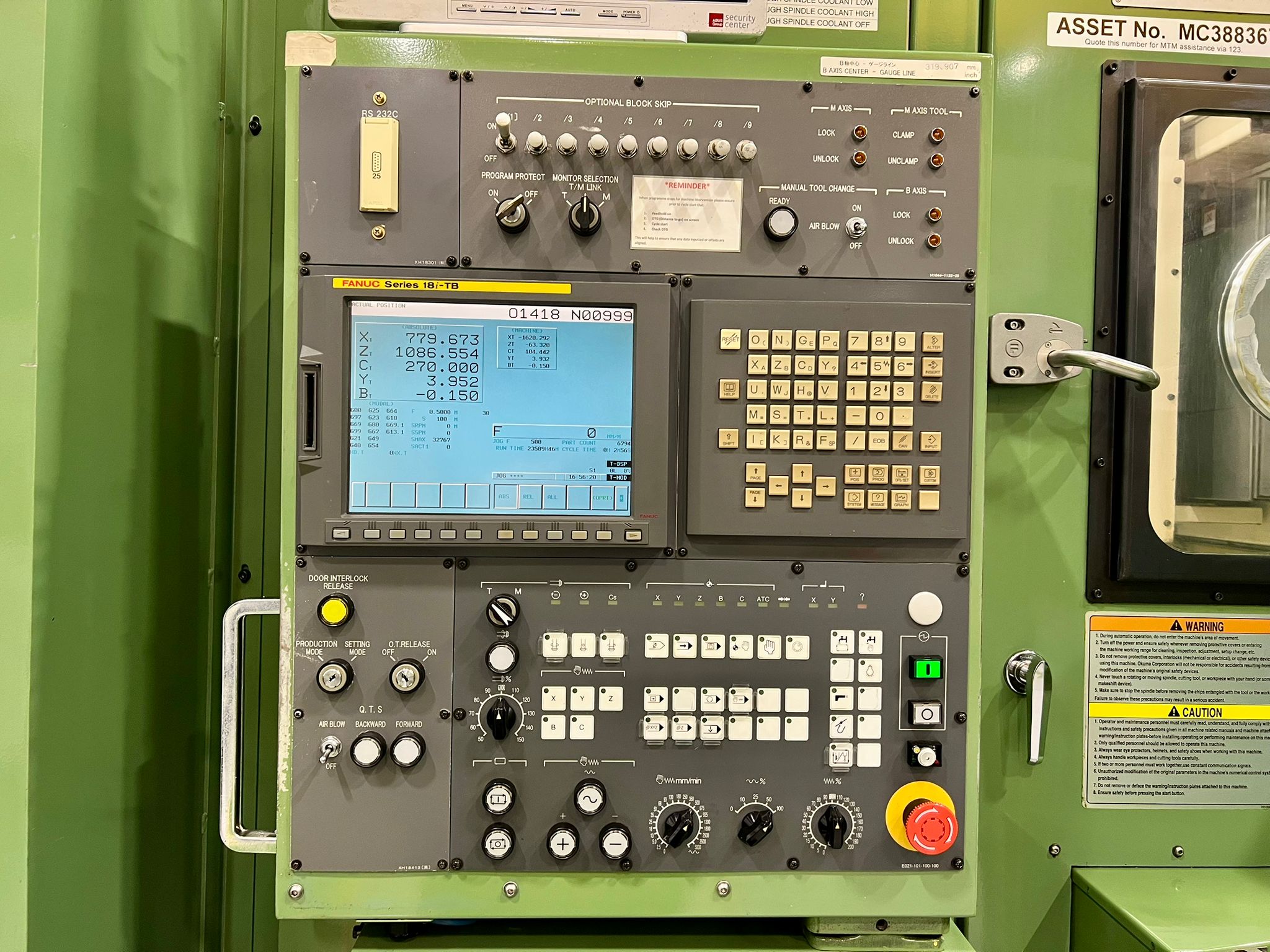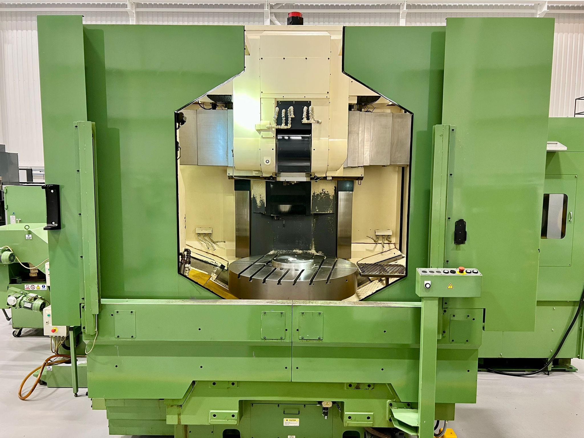Chuck size 1200mm. Maximum turning dia. 1200mm. Maximum Swing 1500mm. Maximum Turning Height 1080mm. Maximum Table Load 2500kg. Axis Travel (X) 1270mm. (Y) +/- 500mm. (Z) 1080mm. (B) 90°, (C) 360° x 0.001° Minimum Increment. Rapid Traverse X/Y/Z 16m/min. Main Spindle Speed Range (Low) 3-123rpm. (High) 6-600rpm. Main motor 30 kW. Driven Variable Spindle Speed 4,000rpm. Driven tooling power 18.5 kW. Spindle Taper ISO 50. 60 Position ATC. Maximum Tool Length 500mm. Maximum Tool Weight 30kg. Through Spindle Coolant Filtration System. FSE Chip Conveyor. Renishaw Spindle Inspection Probe. Renishaw Tool Setting/Breakage Laser Units. Dual Daikin Inverter Chillers. Absolent Oil Mist Extraction Unit. Internal Camera System, Visiport TK2 Spin Window. Foot Switch & Signal Tower. Machine Weight 27,000kg