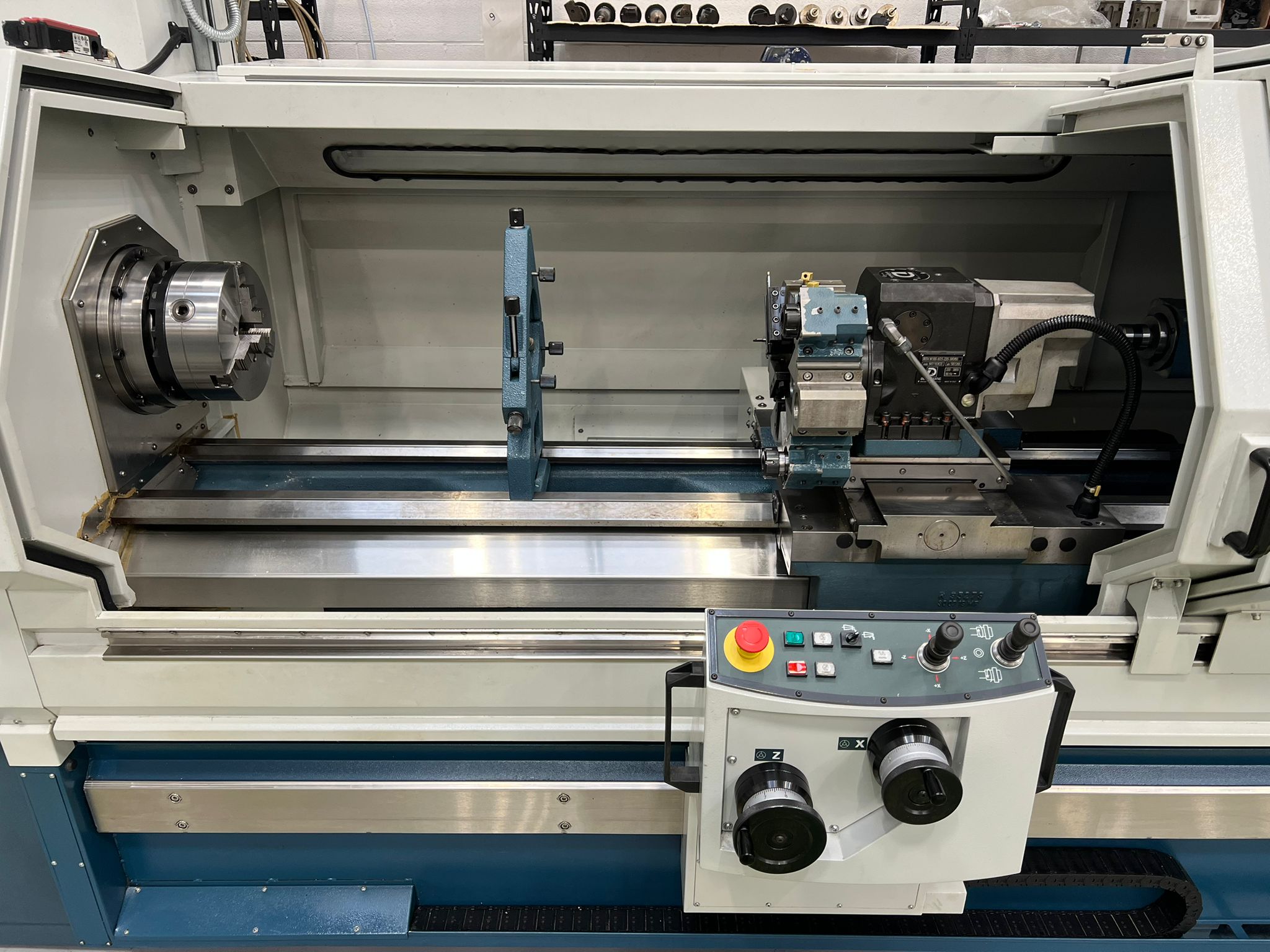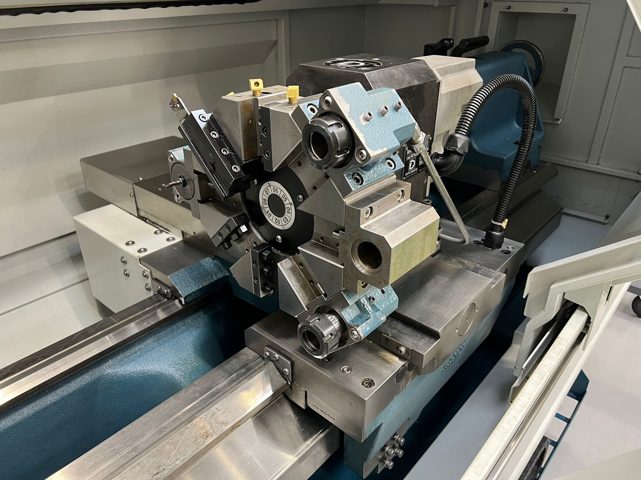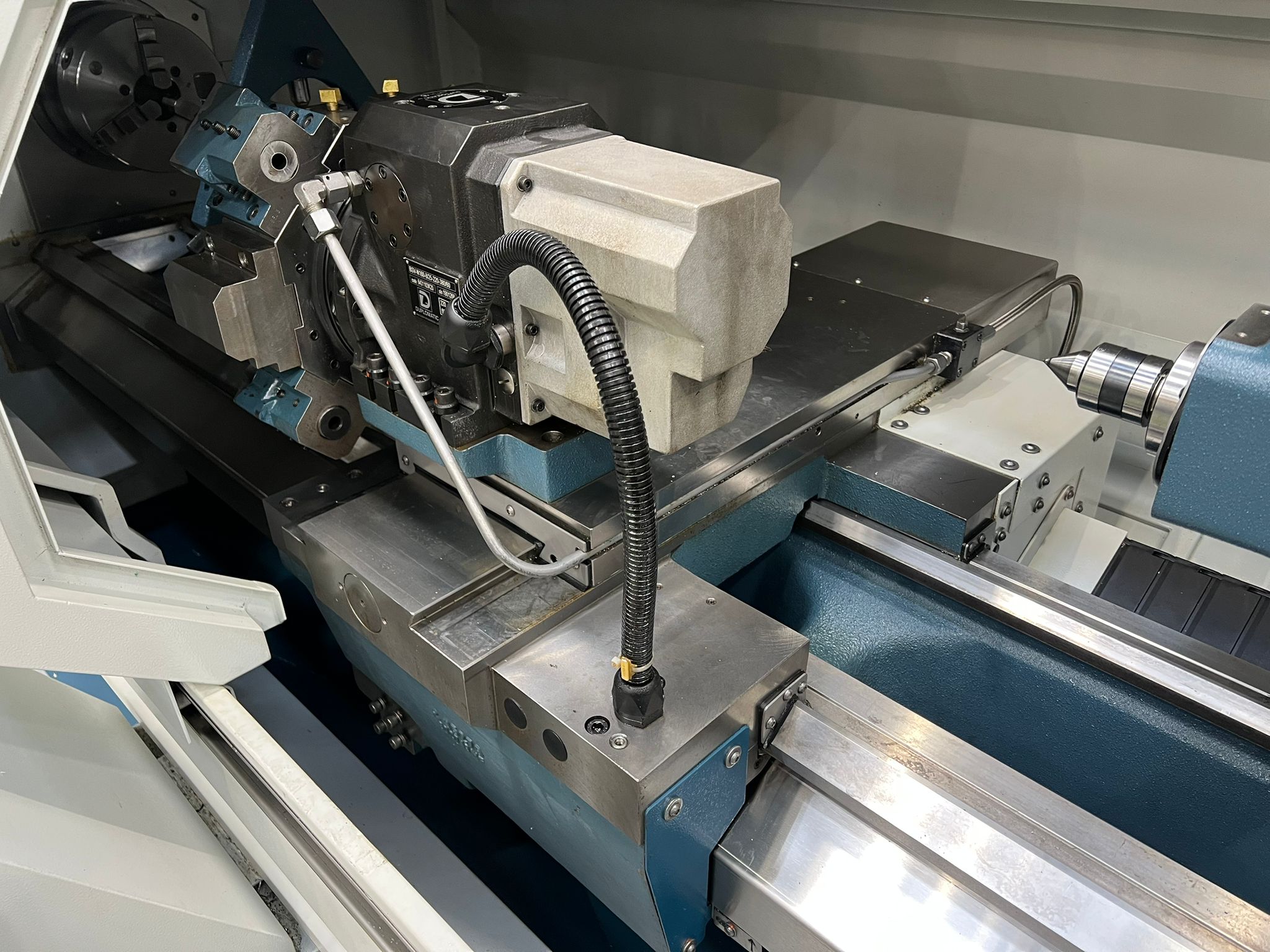 Distance between centers 1500mm. Swing over bed 520mm. Swing over cross slide 255mm. Swing over saddle wings 450mm. Travels X/Y 280/1555mm. Bed Wodth 340mm. Bed Height 336mm. Spindle nose A2-8″. Direct Drive. Rapid Traverse X/Z 10/10. Duplomatic Turret 8 Stations. Body positioning