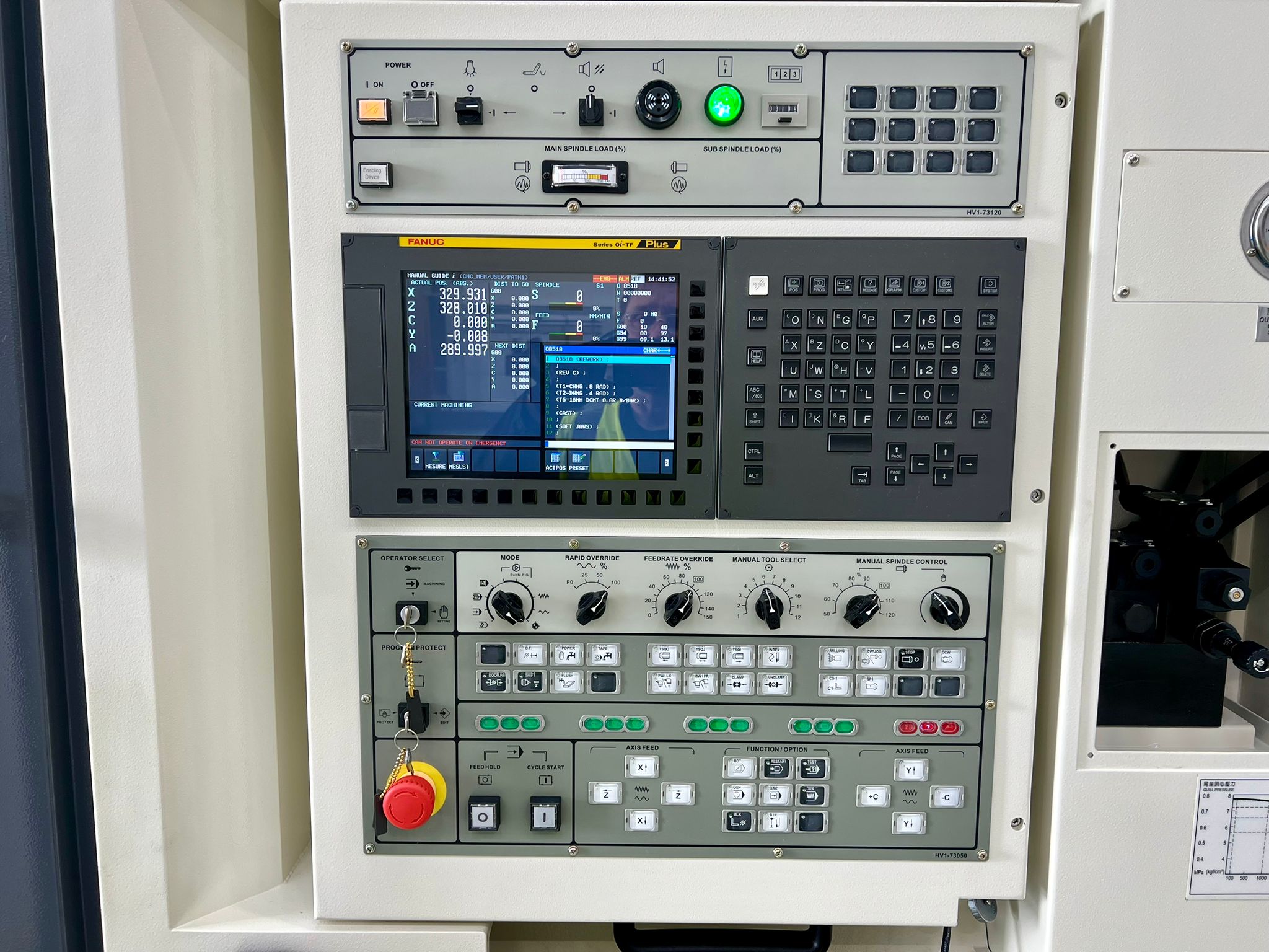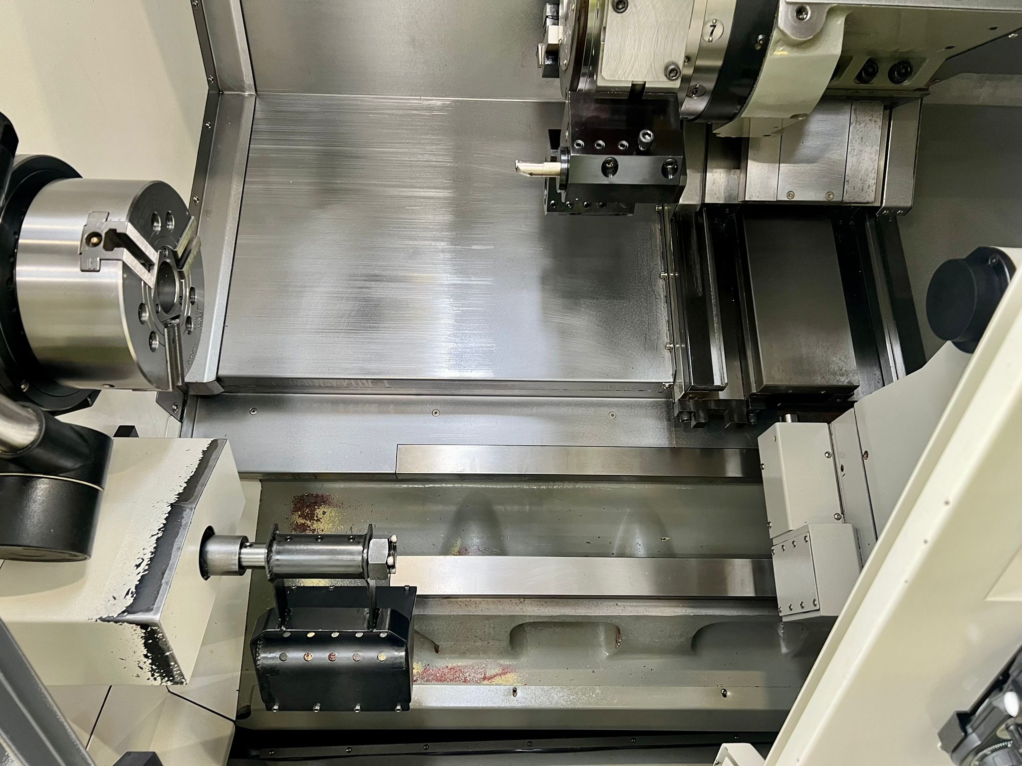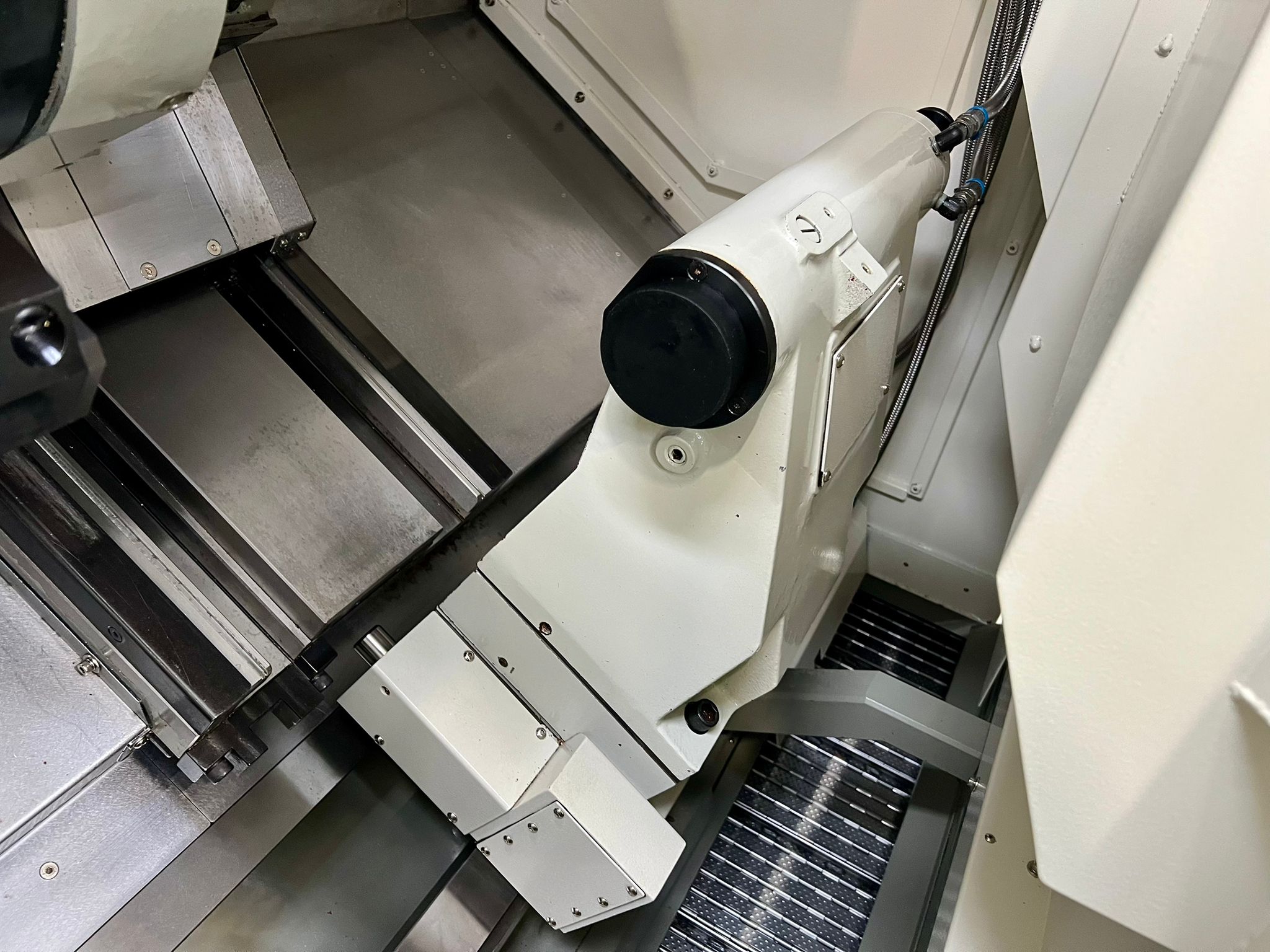 X/Z travels 150mm + 35mm/600mm. Y travel +/- 45mm. Maximum spindle speed 5000 rpm. Spindle nose A2-6 (8”). Spindle bore 62mm. 12 station turret – BMT-55 (all live stations). Maximum milling speeds 4000 rpm. Programmable Tailstock. Tailstock quill dia. 75mm. Quill travel 80mm. 4 MT. Main spindle motor 11/15 (15%) kW. Milling power 4.5 kW. Coolant capacity 290 litres. Manual Guide I (MGI). High Pressure Coolant.