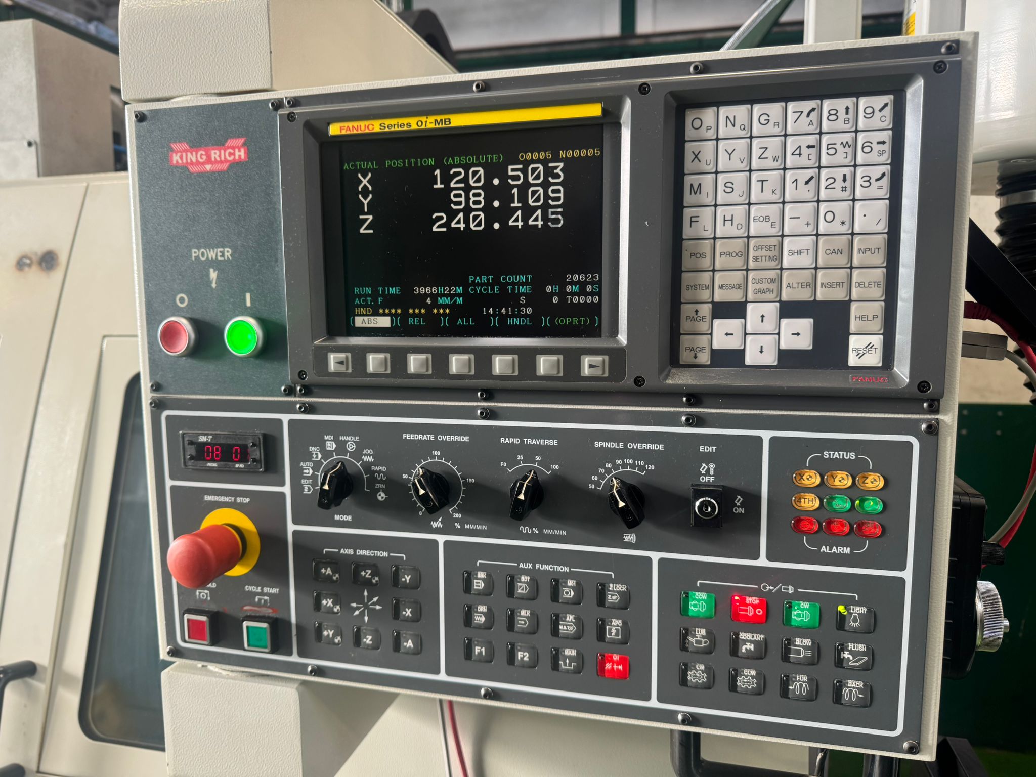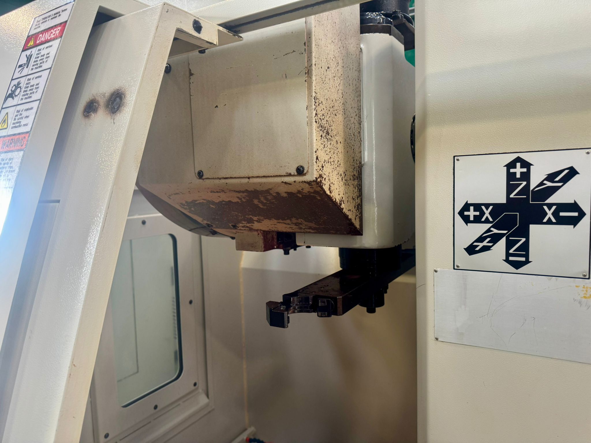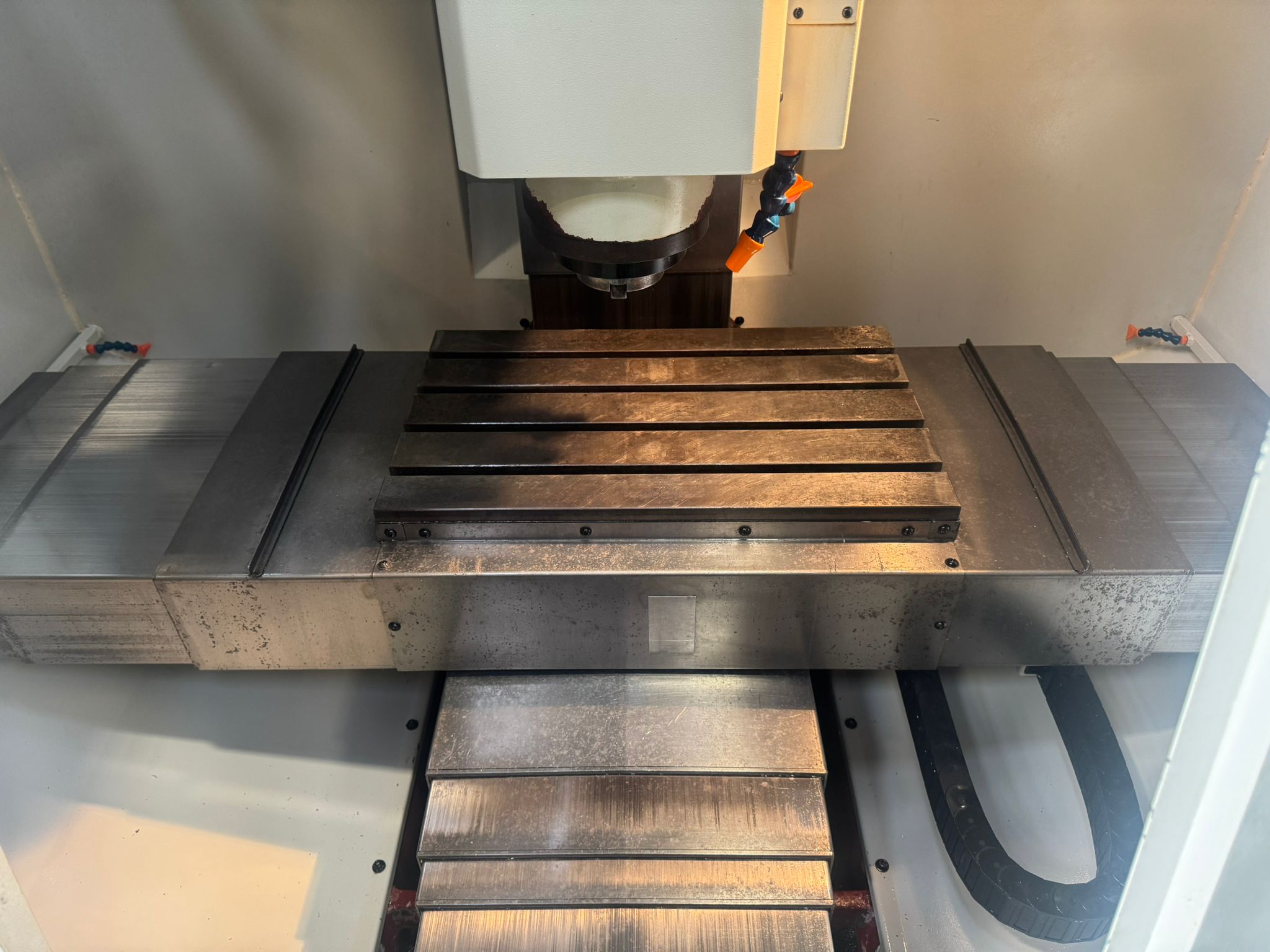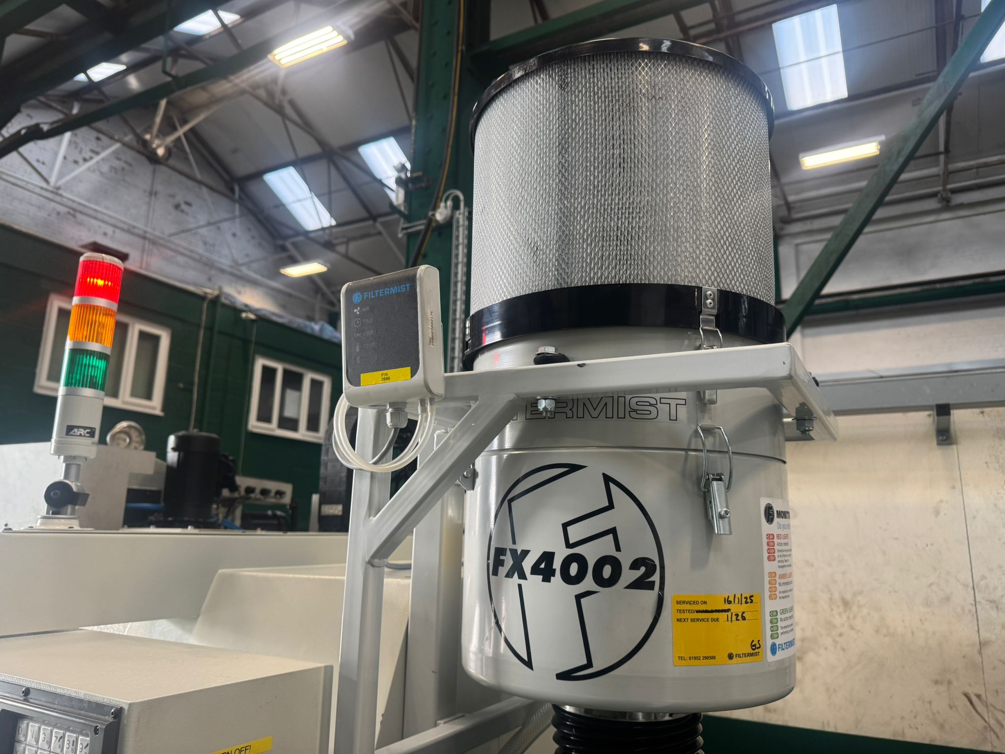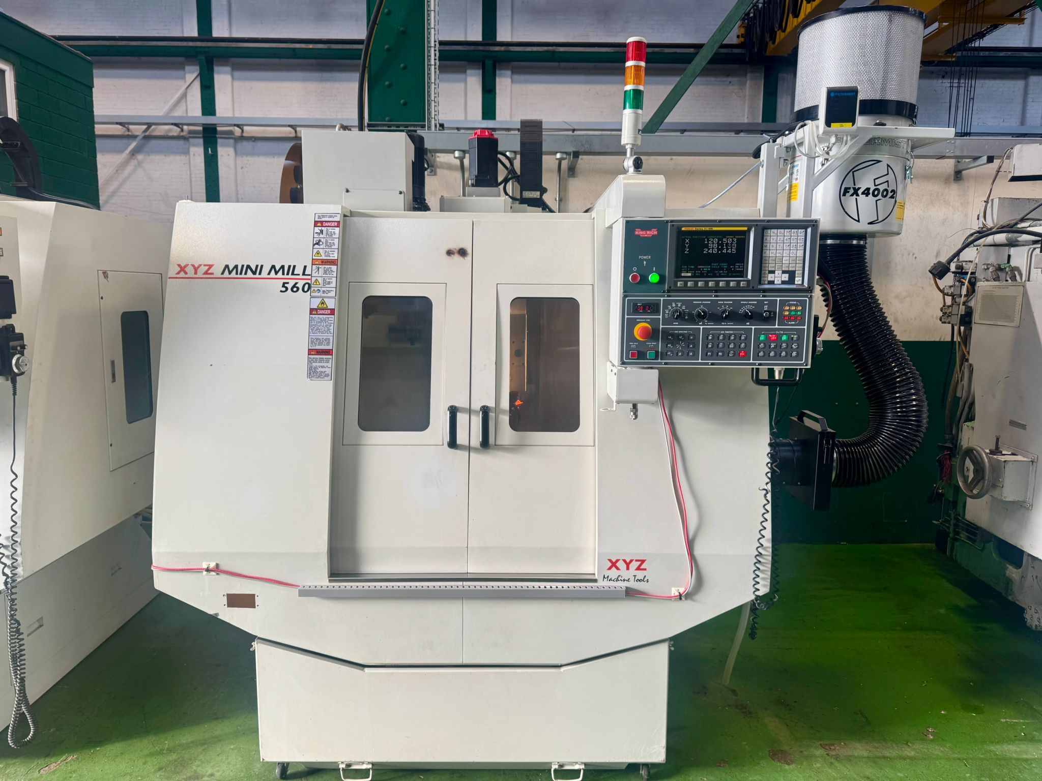 Table size 610 x 370mm. T slot size 16mm. Max loading capacity 320Kg. Travels X/Y/Z 560/400/500mm. Distance from spindle nose to working table surface 100 – 600mm. Distance from spindle centre to main column 440mm. Spindle taper BT40. Spindle Speed 60 – 8000RPM. Feed rate X/Y/Z 1 – 10000mm/min. Rapid traverse rate X/Y/Z 20000mm/min. Tool magazine capacity 16. Max tool weight 8Kg. Spindle drive motor 10HP. Coolant 1/2Hp. Complete with FX4002 Filtermist