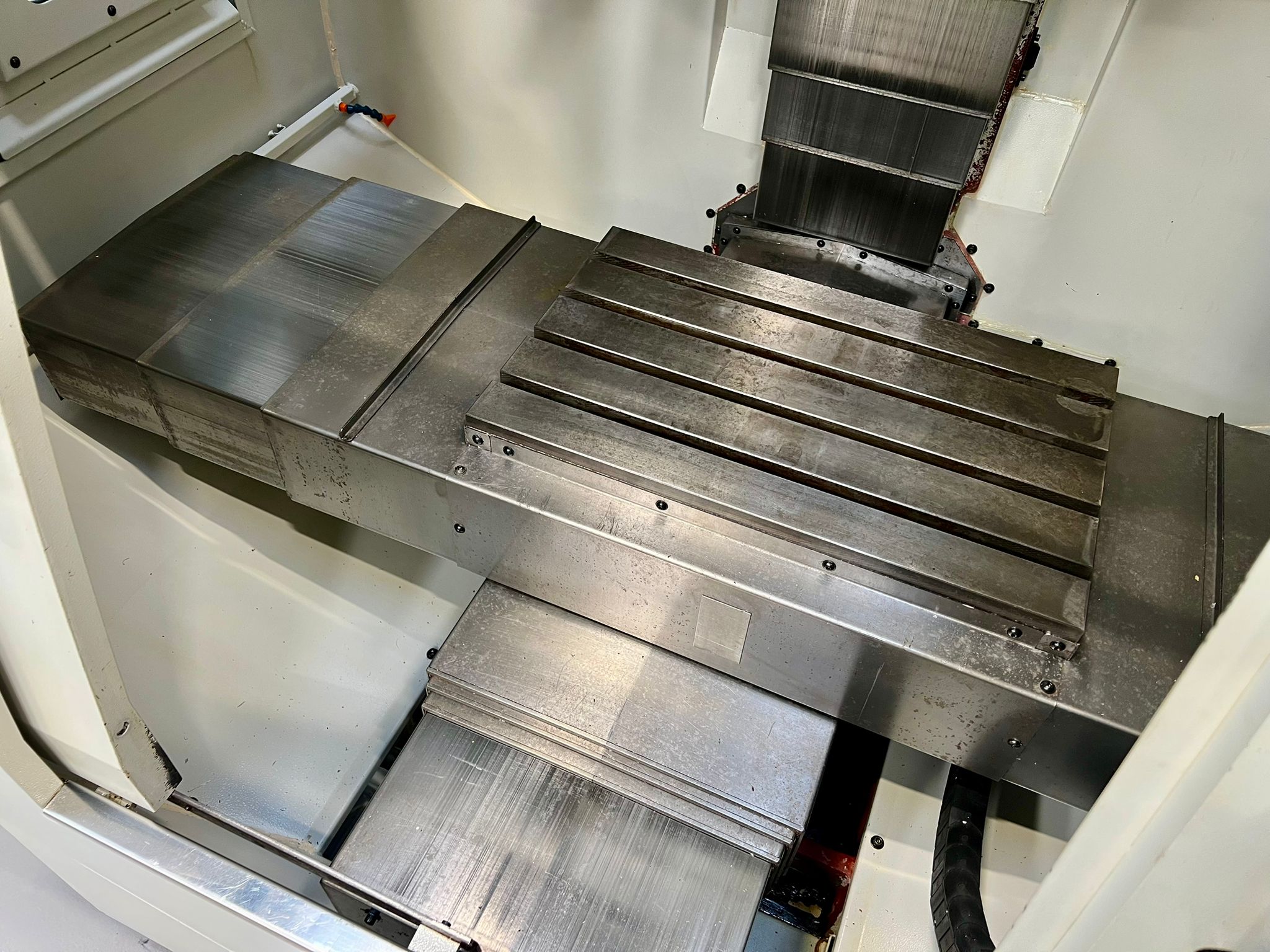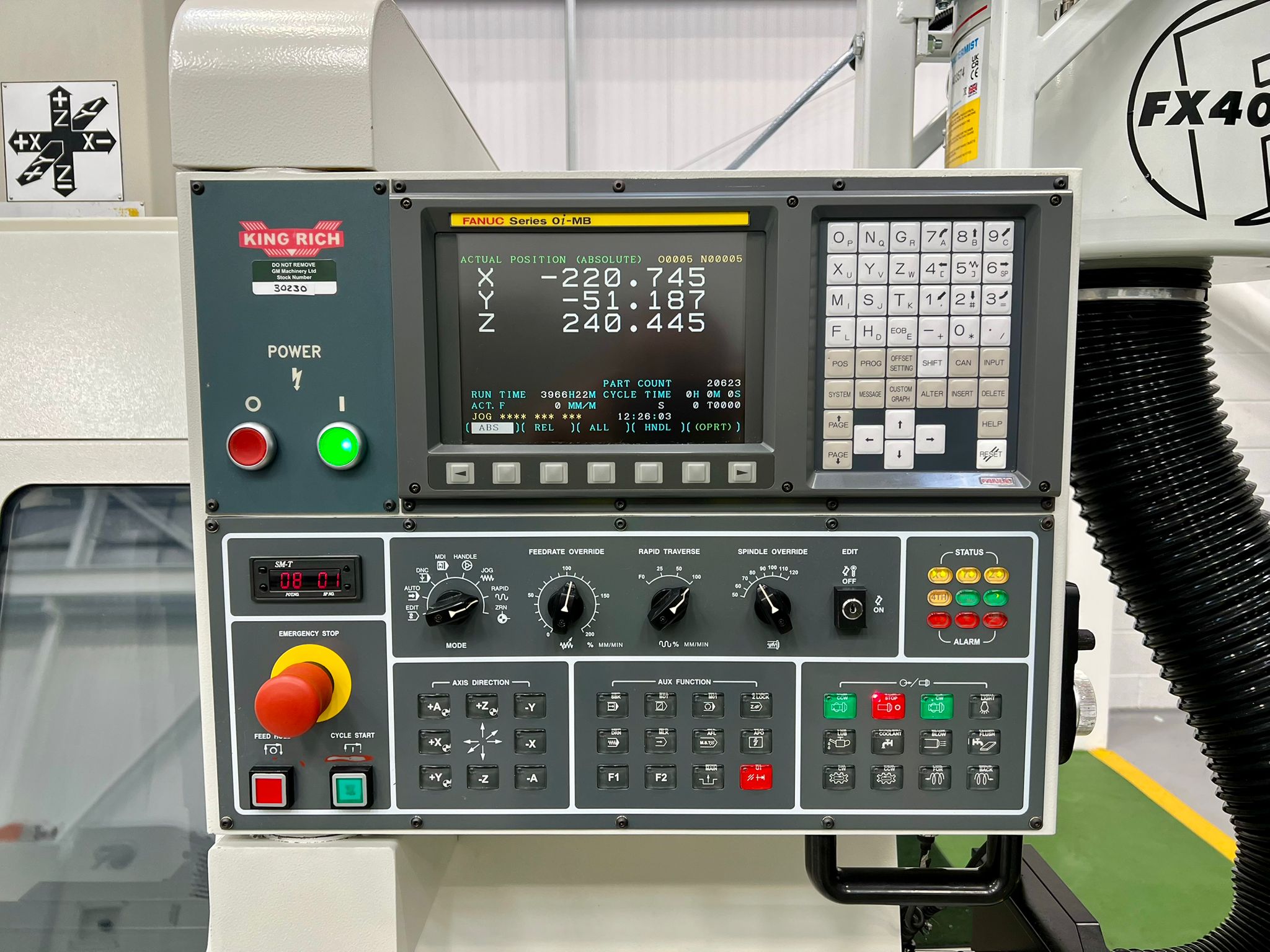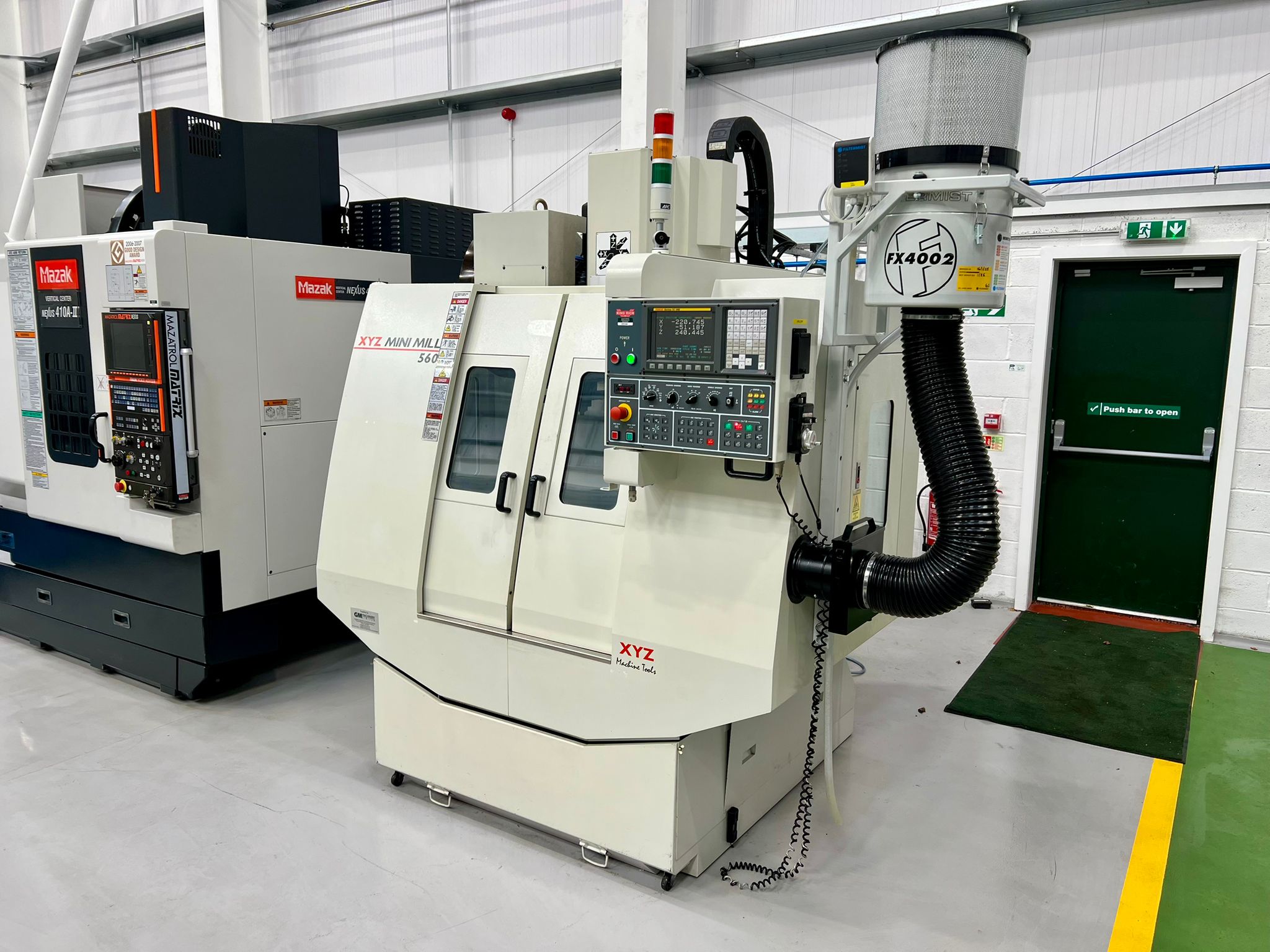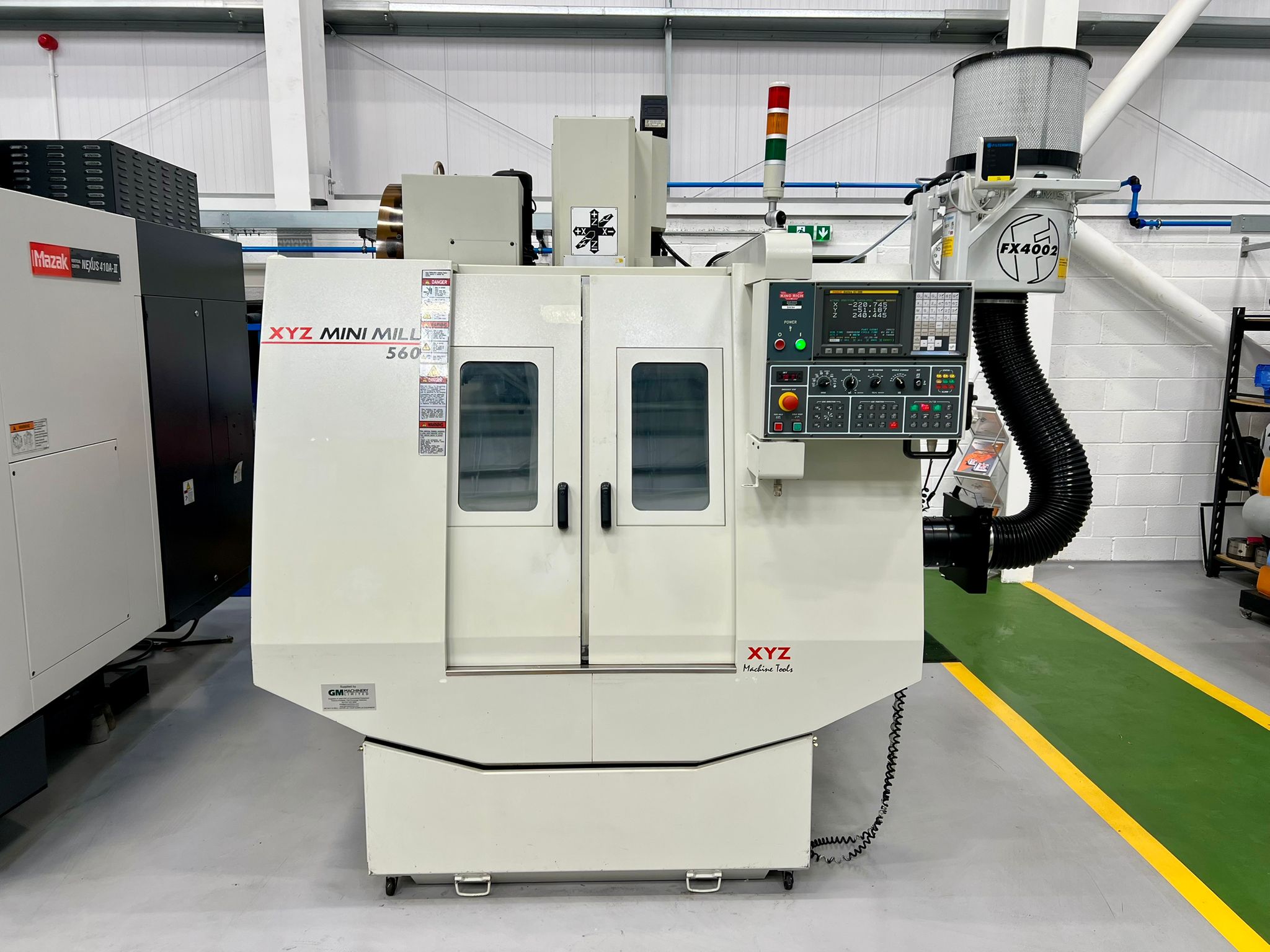Table size 610 x 370mm. T slot size 16mm. Max loading capacity 320Kg. Travels X/Y/Z 560/400/500mm. Distance from spindle nose to working table surface 100 – 600mm. Distance from spindle centre to main column 440mm. Spindle taper BT40. Spindle Speed 60 – 8000RPM. Feed rate X/Y/Z 1 – 10000mm/min. Rapid traverse rate X/Y/Z 20000mm/min. Tool magazine capacity 16. Max tool weight 8Kg. Spindle drive motor 10HP. Coolant 1/2Hp. Complete with FX4002 Filtermist