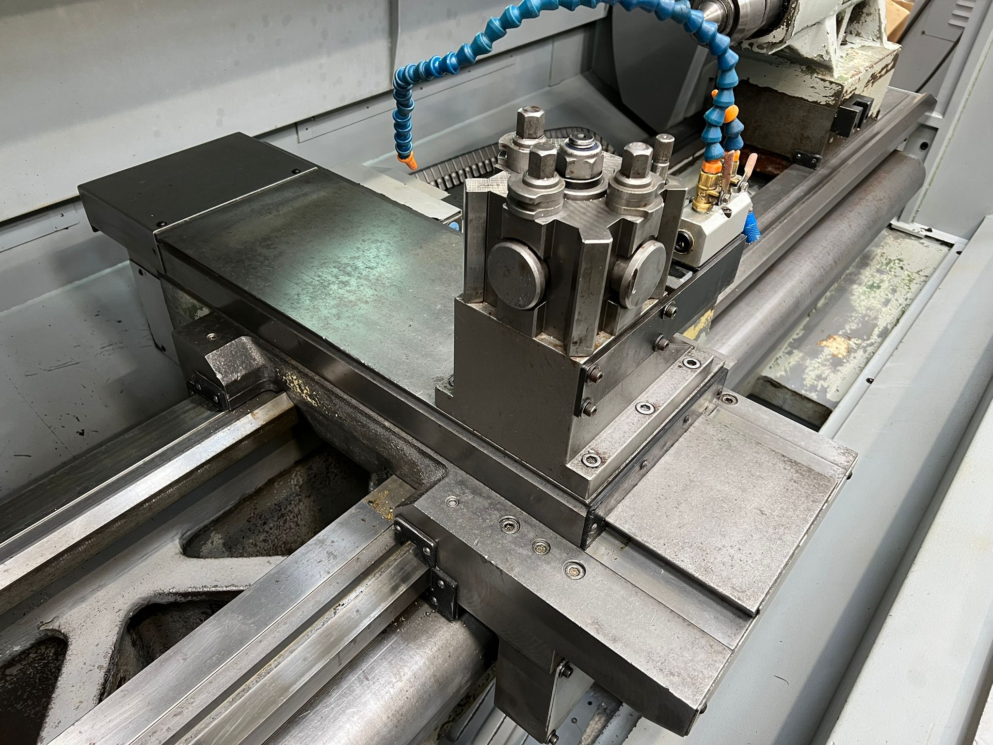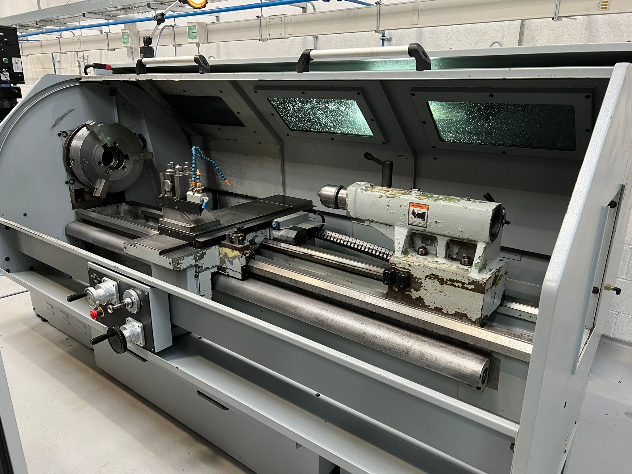 Swing over Bed 560 mm. Swing in Gap 780 mm. Gap in front of faceplate 227 mm (max.). Swing over cross slide 350 mm. Cross Slide Travel 280 mm. Distance between centres 1750 mm. Maximum Cutting Length 1650 mm. Spindle bore 104 mm. Spindle nose D 1-11 camlock. Spindle taper MT7 in bush. Spindle motor 11 Kw (15hp). Spindle speeds 30-1800 rpm – 2 ranges